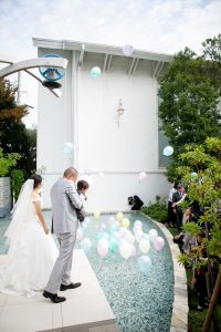 挙式後おふたりは フラワーシャワーの祝福を受けました
