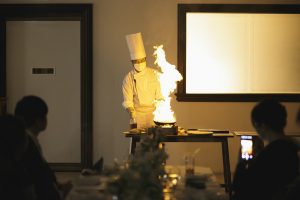 厨房でフランベ演出をしています