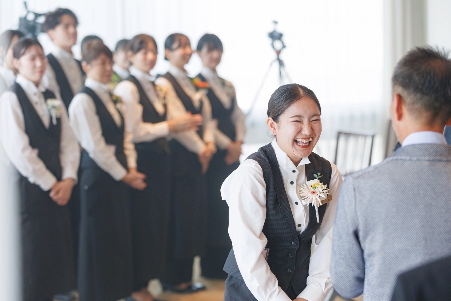 以前私は約3年間”PJ”として結婚式に携わってきました。お料理の配膳やドリンクの配膳はもちろん、担当プランナーの補助や、リーダーとして他のPJへの指示だし、