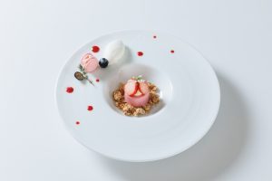 甘さだけではなくさっぱりとした味わいも楽しんでいただけるよう、ムースの中のジュレや、酸味の効いたヨーグルトのソルベも合わせています。