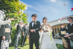 ガーデンでゲストが作る花道を通りながら花びらと一緒にお祝いの言葉をかけてもらえるフラワーシャワーという演出や