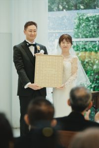 結婚証明書は待合室でゲスト皆様のお名前が刻まれたタイルをはめていただき、