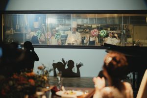 コック帽をかぶりシェフ姿でフランベをします
