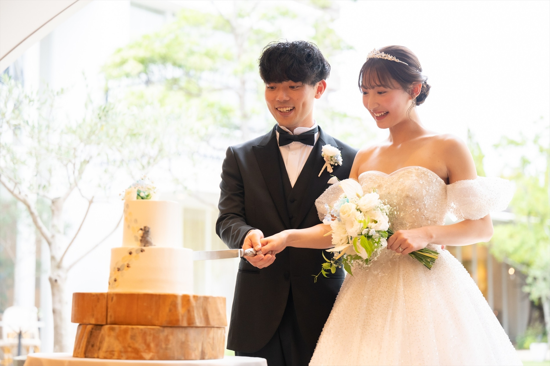披露宴会場のテーマカラーを使った爽やかなケーキにルーク君!